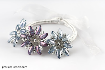 As much as I love the classic black and silver combination, I wanted to introduce a little more colour and femininity into my final design and so I decided to make a romantic flower bracelet. For this one I used some beautiful transparent purple Chilli beads (00030/15781) and a lovely transparent pale blue (00030/14464) and mixed them with silver seed beads. I popped an 8 mm crystal AB fire polished bead into the centre of each one and attached the completed flowers to a simple herringbone rope.